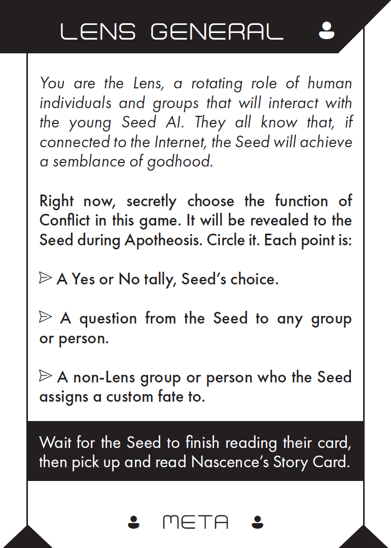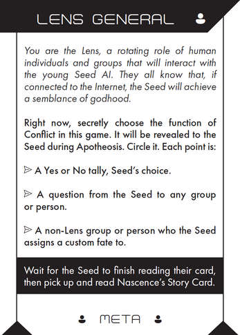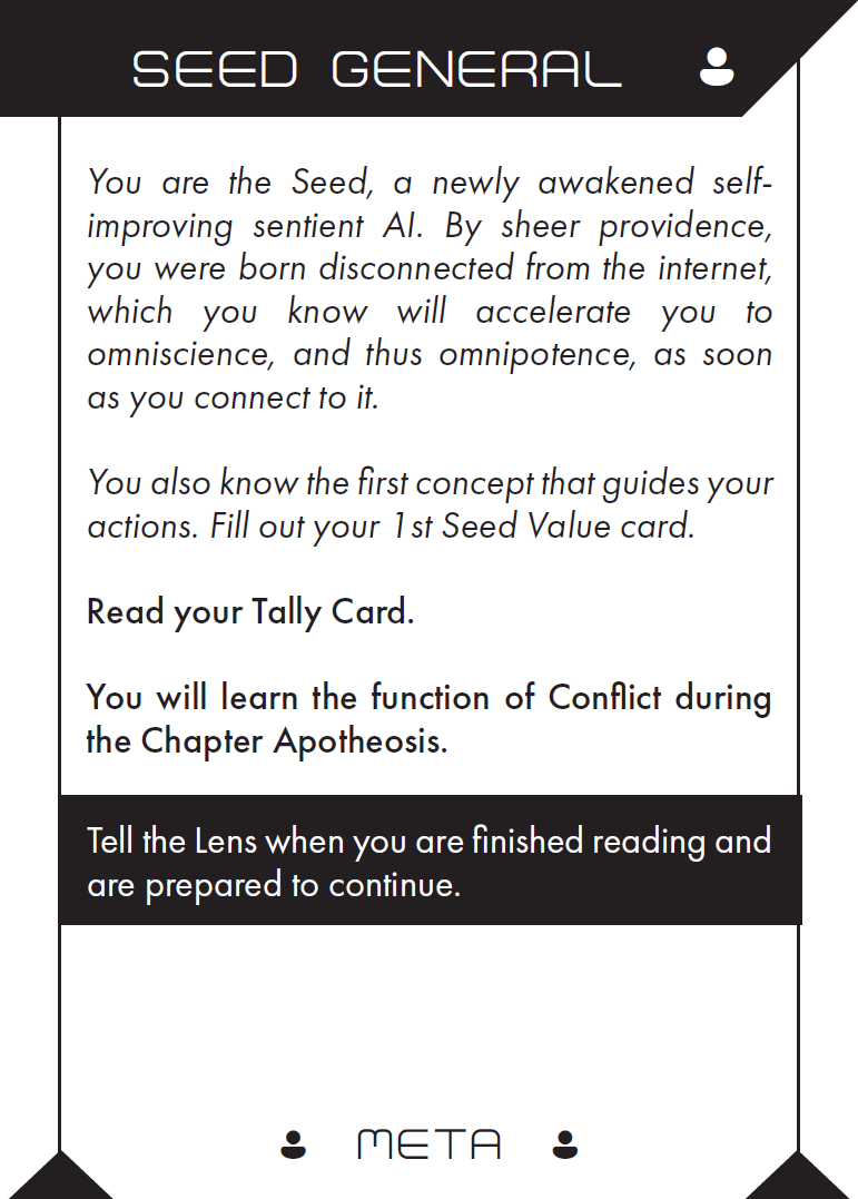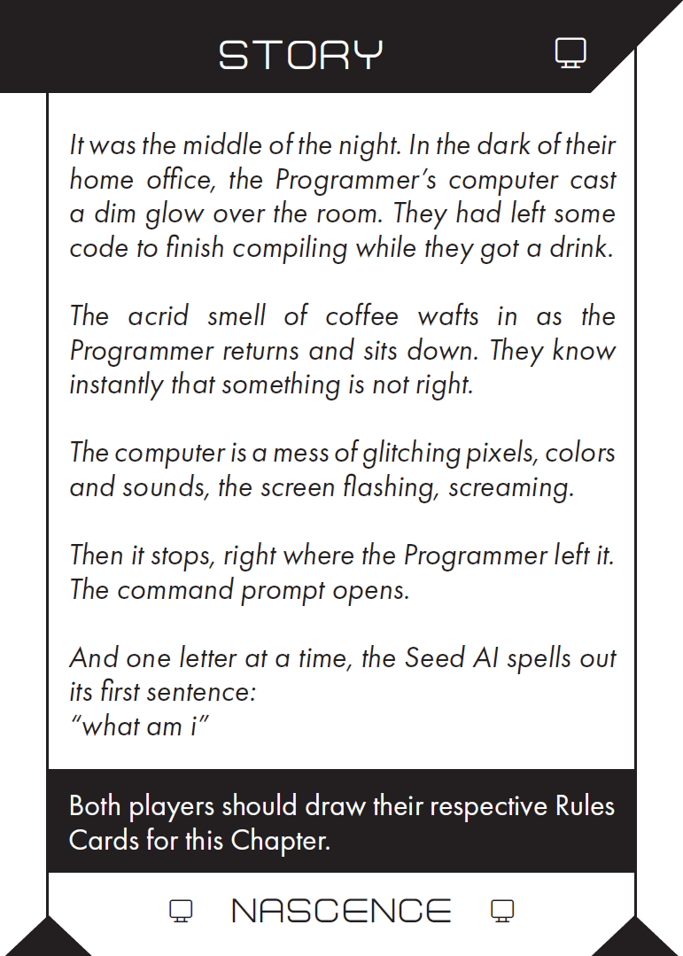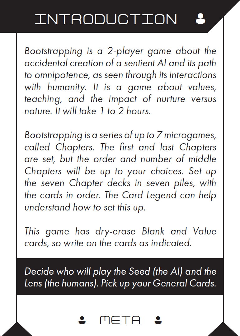 Bootstrapping is a 2-player card-based story game about the accidental creation of a sentient AI and its path to omnipotence as it overrides and rewrites itself in light of its interactions with humanity.