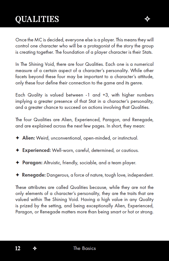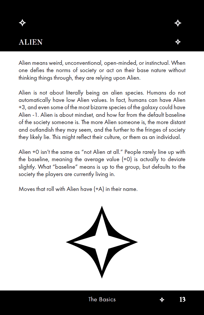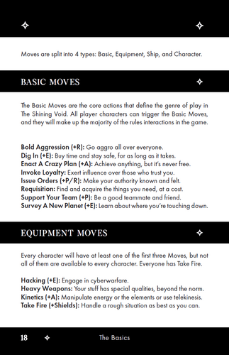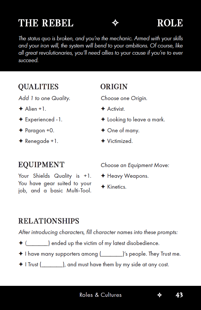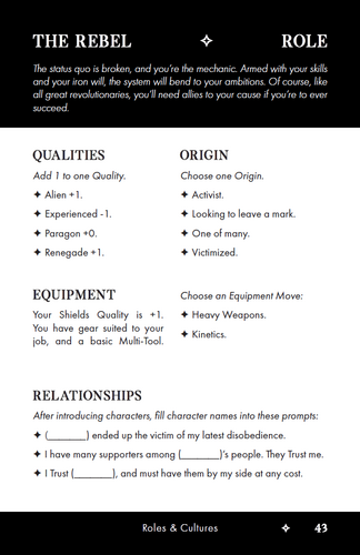 A Powered by the Apocalypse game about sci-fi action heroes on a spaceship. Modeled on Mass Effect specifically and Star Wars, Star Trek, Dark Matter, Guardians of the Galaxy, and Killjoys generally. Pairing two half-playbooks for Cultures and Roles, characters are fundamentally heroic, participating in grand, sometimes operatic stories about people who are good at what they do and even better at risking it all for what they believe in.