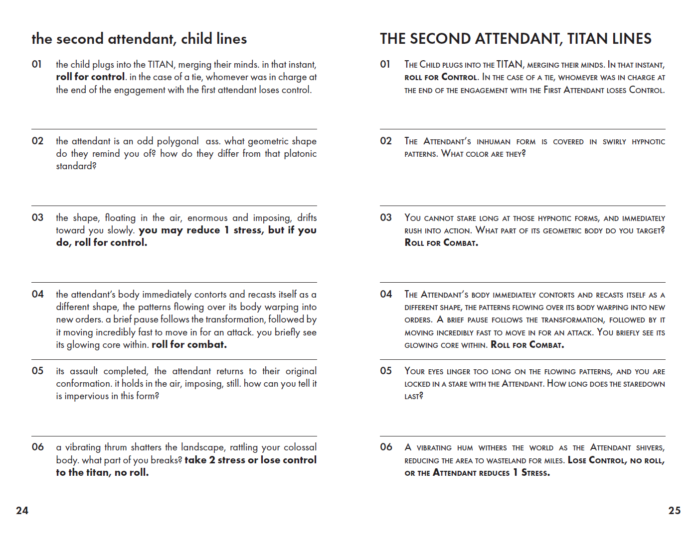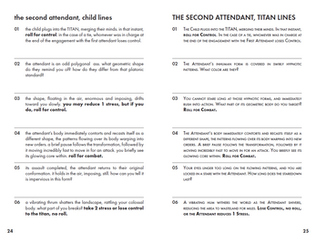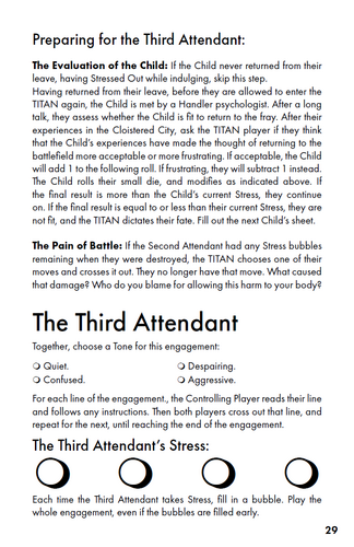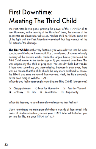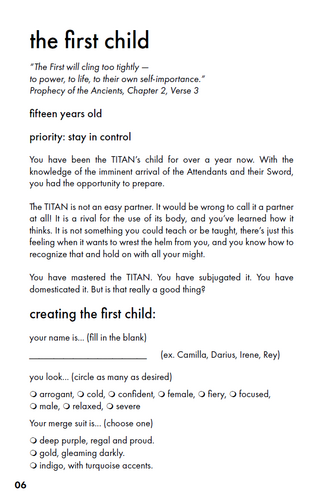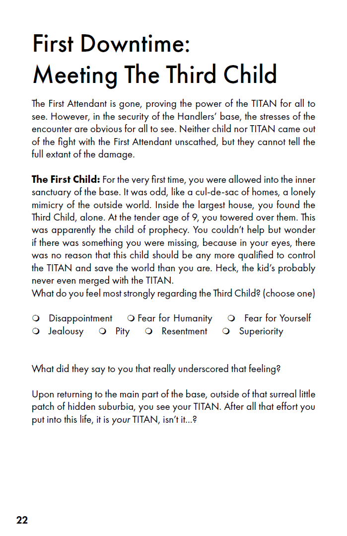 TITAN/child is a game about the struggle between a handful of fated children and an ancient alien mind for control of the alien body, a towering colossus and the only weapon to stop invaders from space from destroying the Earth. It is a game for two players, one of whom will play the TITAN while the other plays the series of children who will attempt to pilot the TITAN. The game starts by filling out the First Child, TITAN, and Setting sheets, then starting play with The First Attendant.
