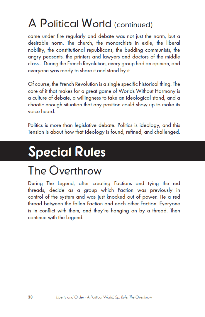 Each game of Worlds Without Harmony revolves around a Tension, a specific irreconcilable ideological question. This book contains the following three Tensions: