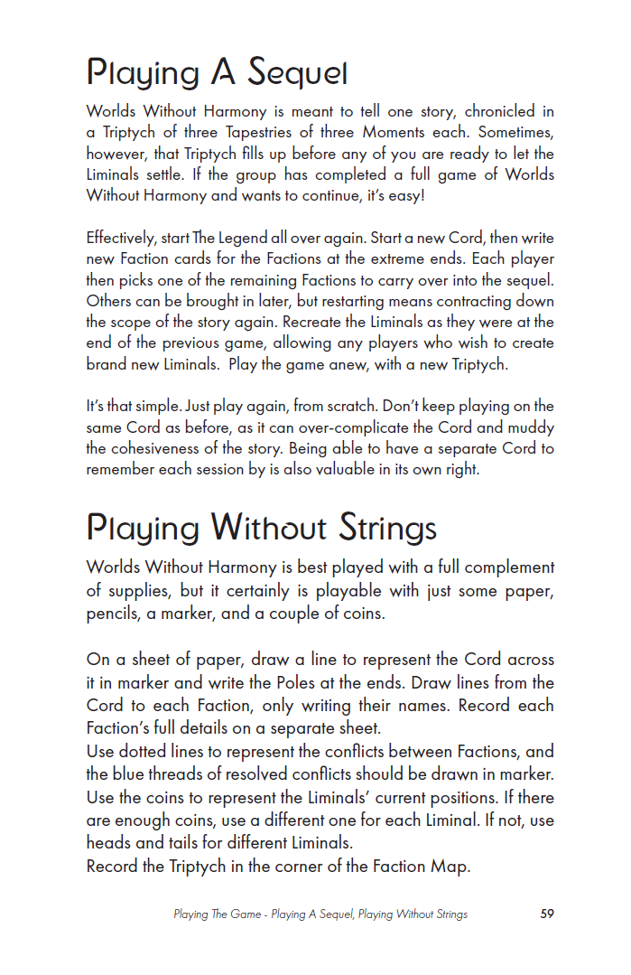 No one answer satisfies everyone, because the things we want are sometimes mutually exclusive. Camps, factions, and parties organize around answers to these questions, but some people don’t know where they fit in. Worlds Without Harmony is a game about those people, exploring the stances and factions in a conflict, and changing and watching those Factions as they come together and tear apart.